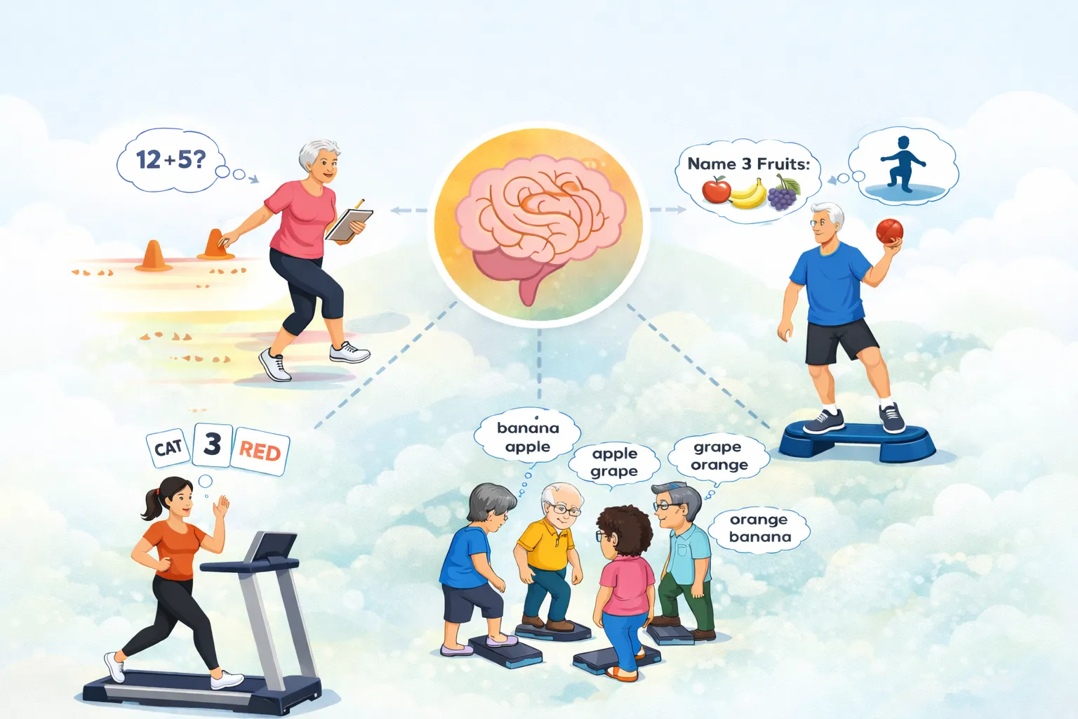 • Dual Tasking Activities (30 minutes): Engage in cognitive tasks (e.g., word recall, math problems) while performing physical movements (e.g., walking, lunges).